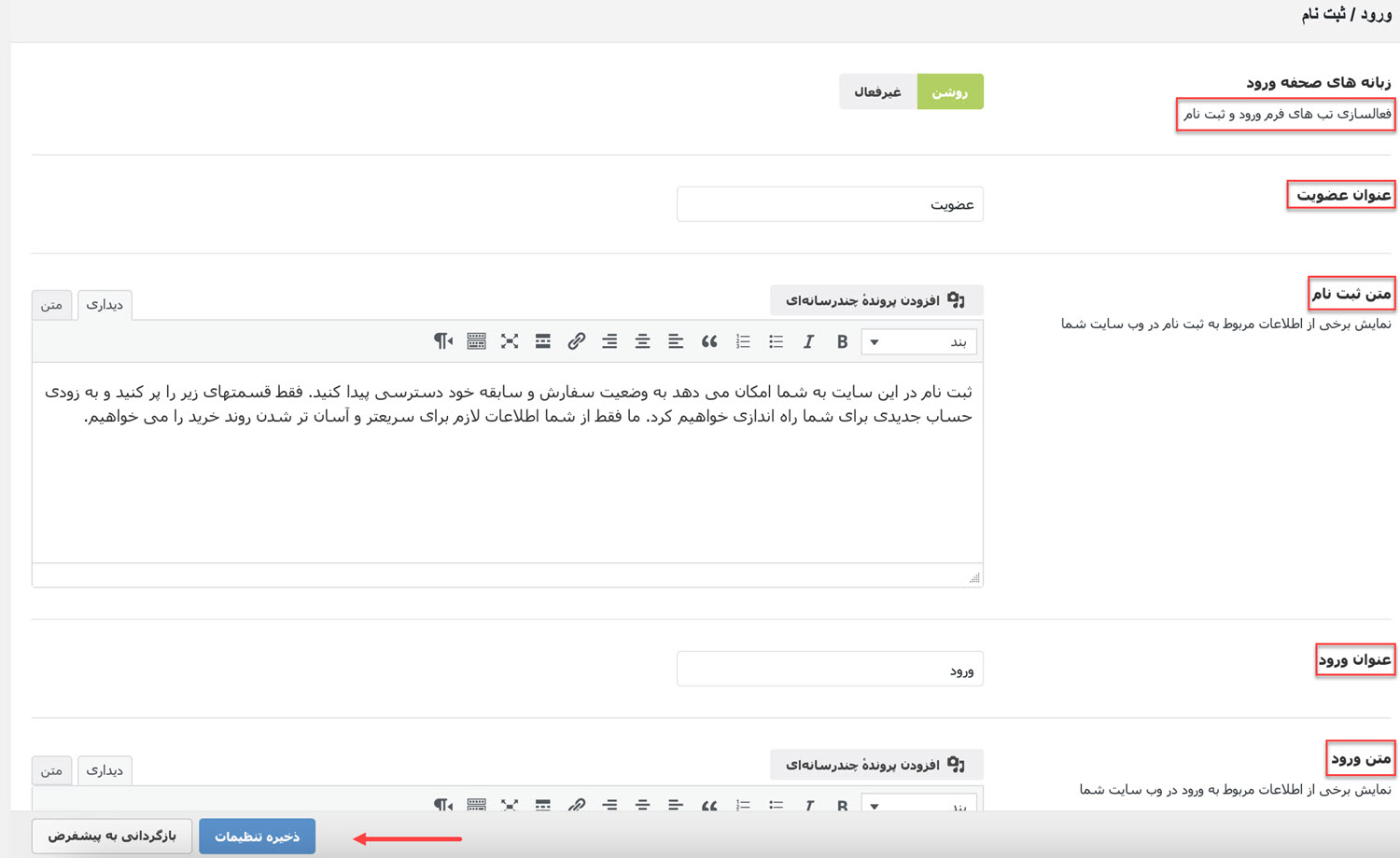 - متن ورود: در این بخش میتوانید برای ورود کاربران یک متن اختصاصی ایجاد کنید.