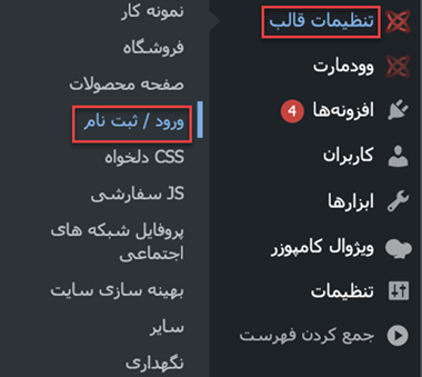 اگر از قالب وودمارت راست چین استفاده میکنید این قابلیت به صورت اختصاصی در این قالب وجود دارد که میتوانید بدون به افزونه چنین قابلیتی را به سایتان اضافه کنید، برای ایجاد فرم ثبت نام در قالب وودمارت باید ابتدا پس از نصب قالب، از بخش تنظیمات قالب وارد قسمت ورود و ثبت نام شوید. (مانند تصویر زیر)