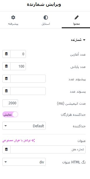 - این بخش شامل 3 گزینه خواهد بود با نام های بخش محتوا، استایل و بخش پیشرفته که میتوانید با توجه به نیازی که دارید هر بخش را دستی و کاملا بدون کدنویسی سفارش سازی کنید.